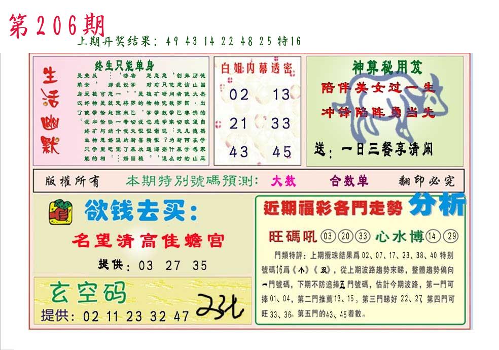 | 1204期:精准单双〖单数〗开:03兔对 | |